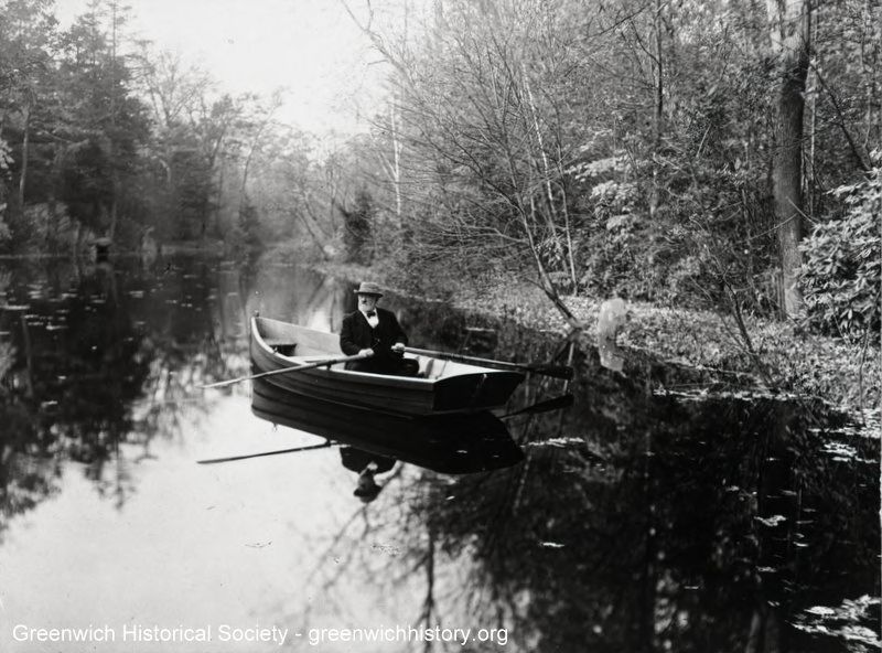 E. C. Benedict dressed in suit and hat seated in a rowboat floating on a small pond/river on his propertyCollection