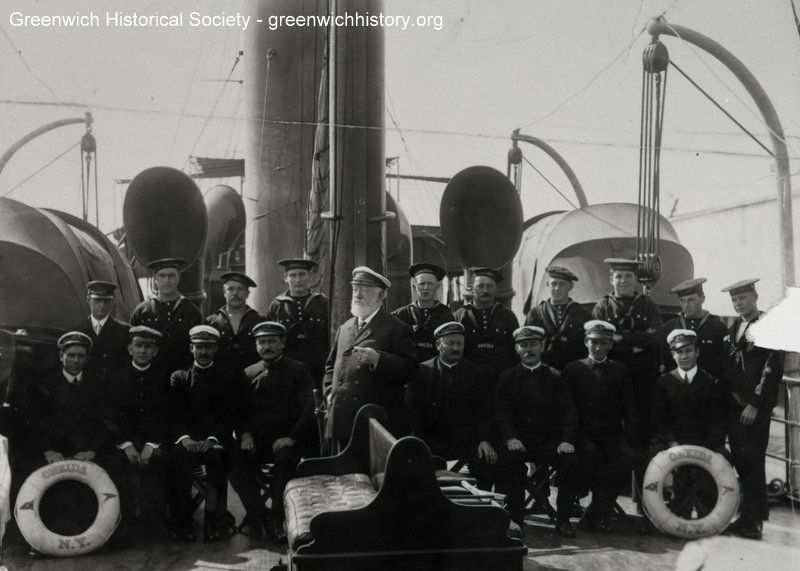 E. C. Benedict and crew posed on the deck of his yacht, the Oneida. The ship's equipment is partially visable in the background.Collection