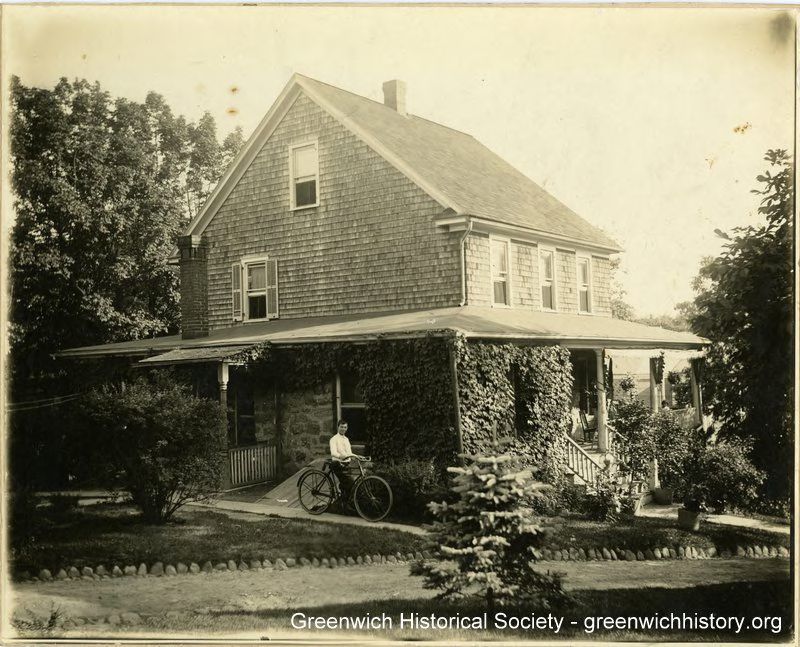 Front view of two story house with wood shingle exterior and large front porch with awnings. Extensive foliage in front of the house. Eddie, 15 years old, is seated on a bicycle in the side walkway and Celia, 6 years old, is slightly visable on the front porch.
