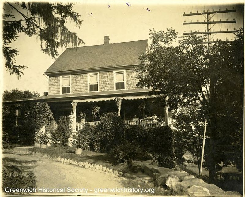 Front view of two story house with wood shingle exterior and large front porch with awnings retracted. Extensive foliage in front of the house. Five people are slightly visable on the porch: Mary, standing near the post, and seated are Maria, Eleanore, Anita and Celia.Collection