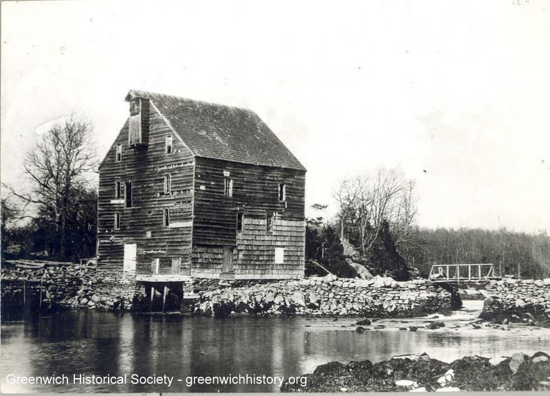 Clapboard and shingle barn like structure on rocky shore with water flow area underneath the building. A wooden bridge over the water is in the lower right corner.Collection