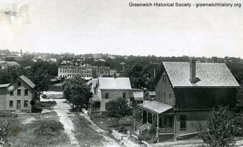 Street sceen looking down Division Street, Byram from Mead Ave. to Byram River. Houses and an empty lot are on either side of the street. Abendroth Foundry in Port Chester is in the center background.Collection