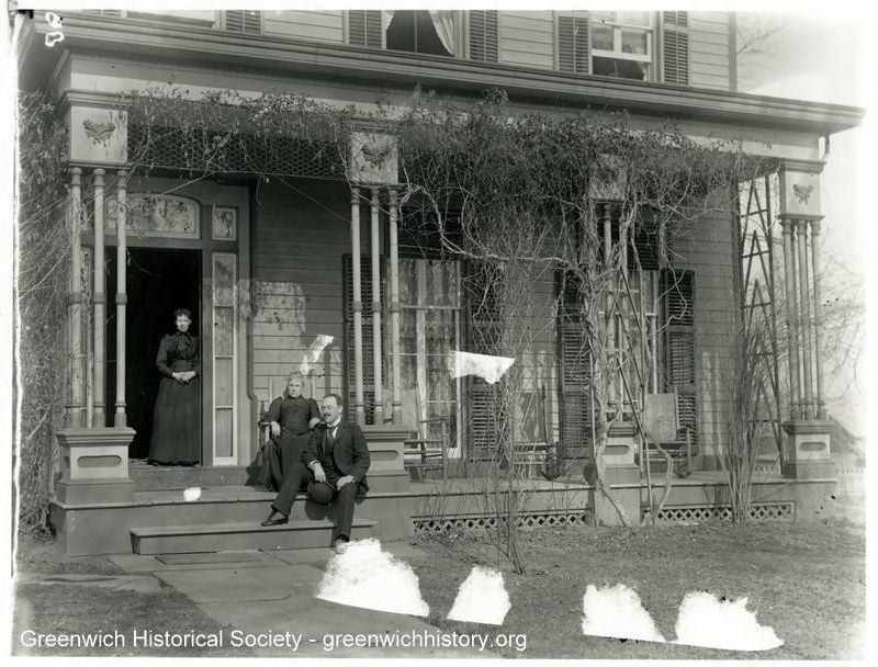 Julia Bell standing in doorway of house on Field Point Road with her parents seated on the front porch. A large wisteria-like vine is growing up the center column of the porch but is not yet full of leaves. Four rocking chairs are on the porch.Collection