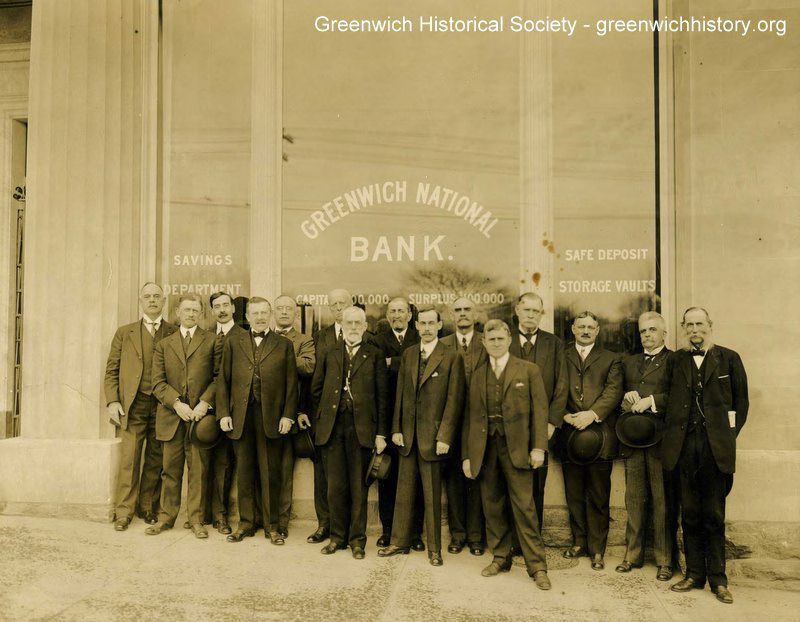 Fifteen men wearing suits and vests, some with hat in hand, standing in front of the Greenwich National Bank (located in the Smith Building on Greenwich Avenue).Collection