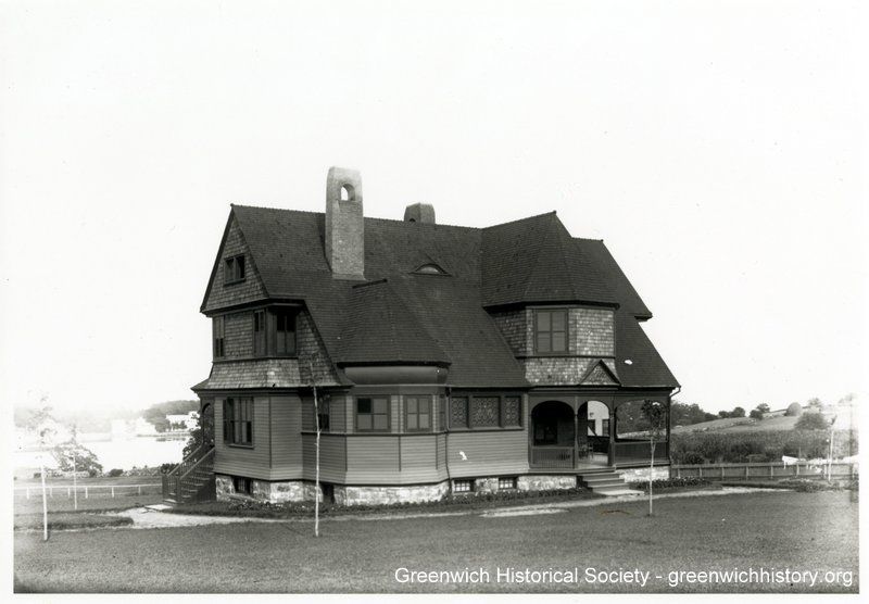 House on Field Point Road built in the Queen Anne style. The house has a stone foundation; clapboard exterior first floor and shingled exterior second floor; two bays in front; two porches, one of which extends around the corner of the house; a decorative ribbon window in front; and two brick chimneys.Collection