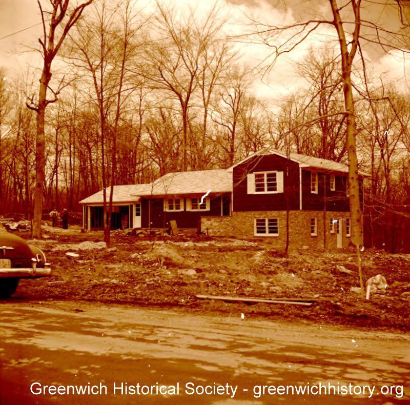 A front view of Bowman Drive. Two story home with half stone and wood siding. There is a car parked in the foreground and two men standing in the driveway.Collection