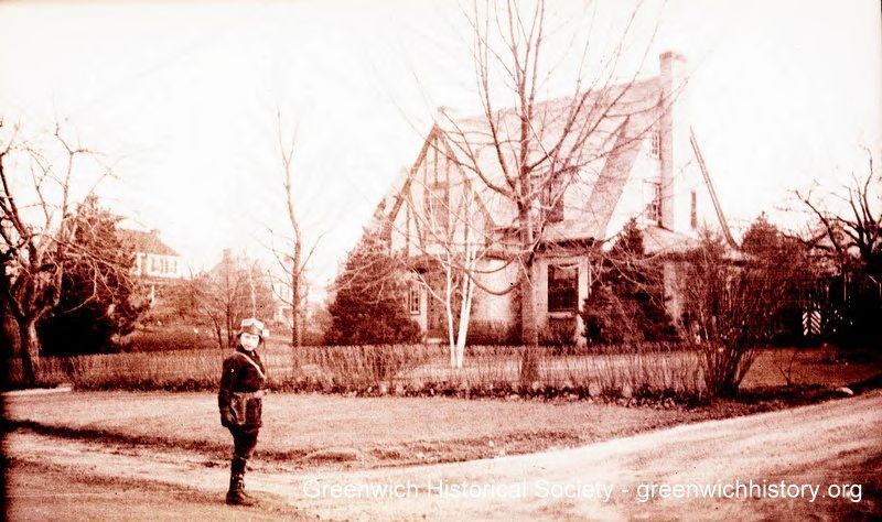 Two story home with two exterior chimneys and a decorative element on the front facade. There is a little boy in the foreground.Collection