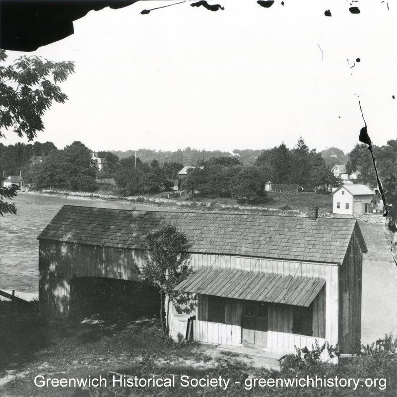 House rented by Michael Taylor and the newspaper stand he owned in what formerly was the Brush storehouse on Strickland Road, near the current location of 42 Strickland Road, adjacent to the River Road bridge and accross from the Bush-Holley House. (See PC000698 for an earlier view.) This structure was raized in 1907.Collection
