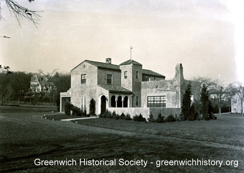 Mediterranean style home at the southwest corner of Broad and Shore roads in Belle Haven. The house has a rounded tile roof, rectangular central tower, and a colonnaded entry to an enclosed patio.Collection
