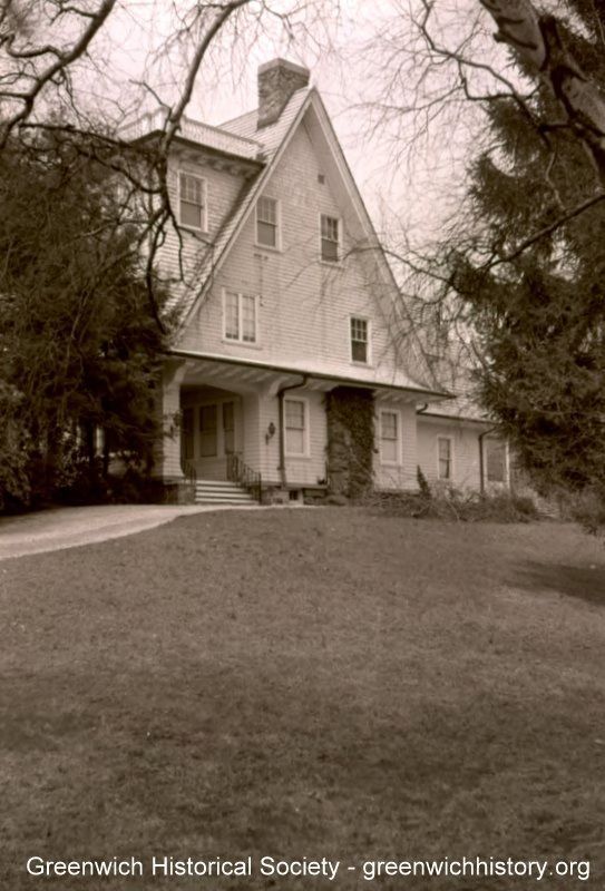 Side view of of the house at 111 Brookside Drive, circa 1950, detailing the entrance, gabled roof, the two story dormer, the surrounding eaves and brackets, and the rear wing of the house. The house was originally built in 1905.Collection