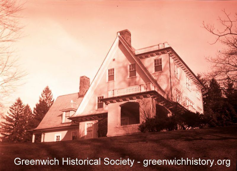 Side view of of the house at 111 Brookside Drive, circa 1950, detailing the gabled roof, the two story dormer, the surrounding eaves and brackets, and the rear wing of the house. The house was originally built in 1905.Collection