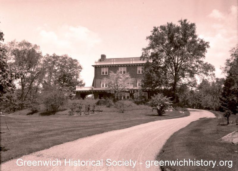 Shingled home with extensive porches on the north and south ends, a steep pitched, side gabled roof with a two story, flat roofed dormer, three stone chimneys and a drive-through portico. The house was built in 1905.Collection