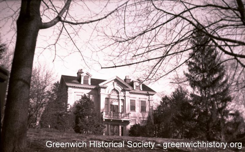 Majestic, two story home at 101 Brookside Drive with dormers, no shutters on the windows, and tall evergreen trees obscuring the first floor of the house. The full height, centered gable projecting from the center of the house is adorned with a second story balcony beneath french doors, surrounding rectangular windows, and a half-round fanlight window on top. A decorative arch extends from the second story into the gable's front pediment above the roof. Wide, bracketed eaves trim the pediment and extend along the entire roof junction.Collection