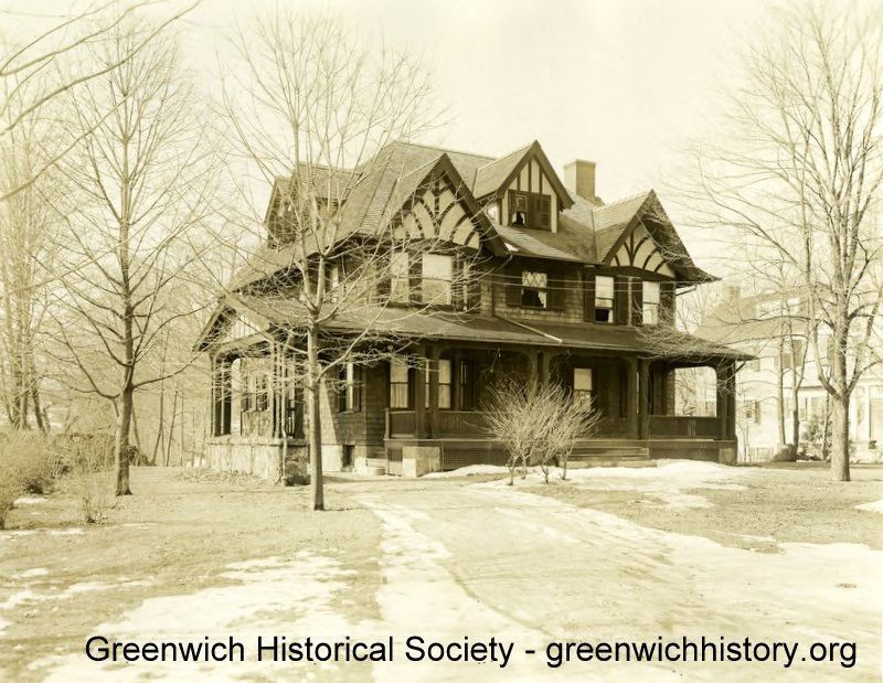 Shingled home, circa 1928, in winter with light snow. The house has a with full width front porch, drive through portico, and several steep pitched dormers with coordinating half-timbered designs.Collection