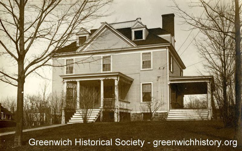 Clapboard house at 49 Brookside Drive, 1937, with raised porches in the front and on the side.Collection