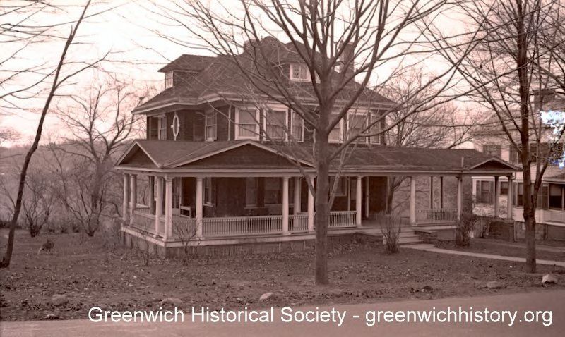 Shingle style house at 42 Brookside Drive, 1937, with a wrap around porch; drive through portico; twin bay windows and an oval window on the second story; and large roof dormers.Collection