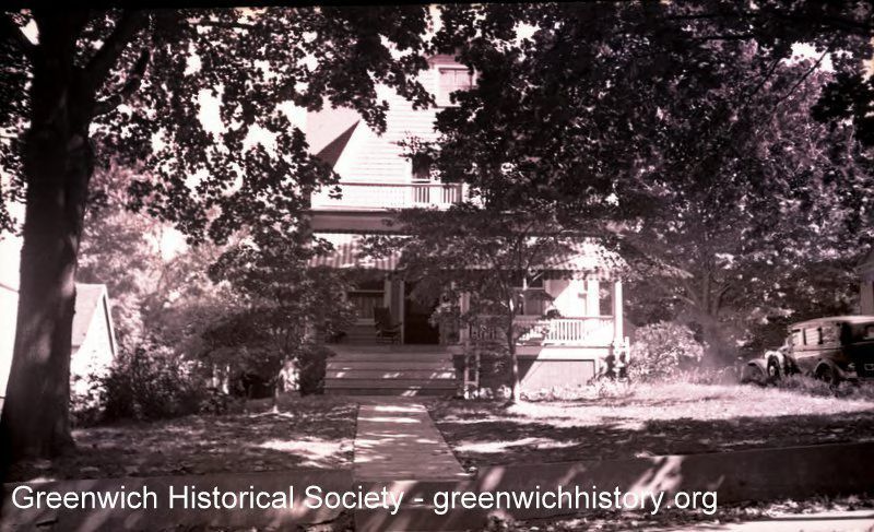 Front view of house at 37 Brookside Drive in 1937 with awnings extended and Model A type car parked in the driveway.Collection