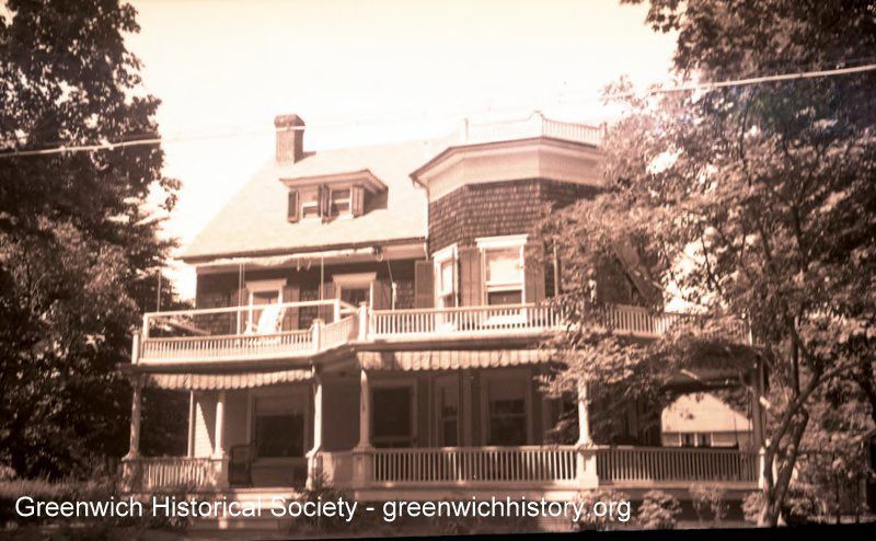 Summer view of shingled home with identical wrap-around porches and bay windows on the first and second stories.Collection
