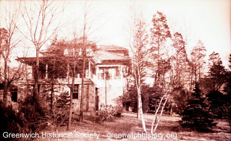 A symmetrical house with wide, bracketed eaves overhanging the roof, located at corner of Ferris Drive and Rockmere Avenue on property that was part of Greenwich Gardens.Collection