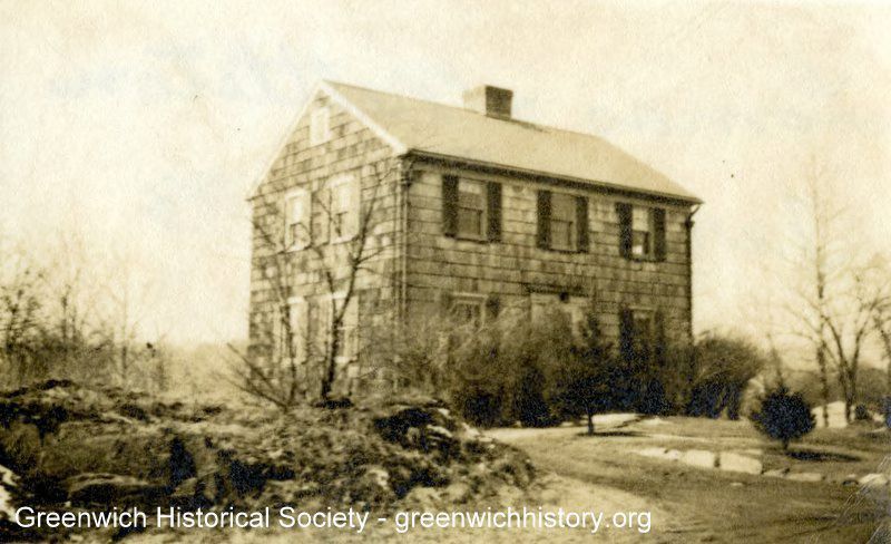 Two-story shingled home with central chimney and three-ranked windows in front, located on property that was part of Greenwich Gardens.Collection