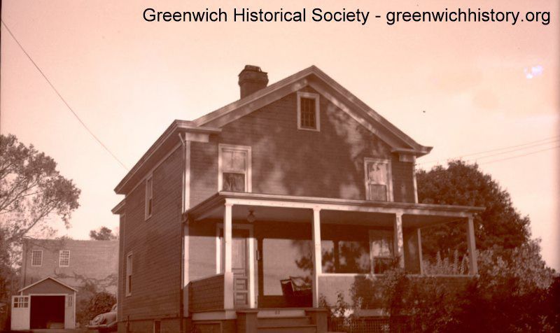 This modest, two story house has a detached, one car garage in back. A rounded car trunk with exterior spare tire cover is visible behind the house.Collection