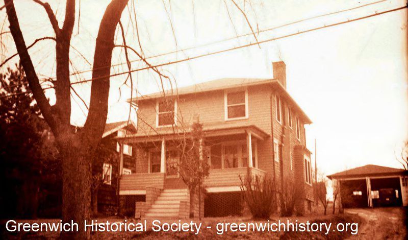 Two story clapboard home with elevated front porch. A car is parked in the detached, two car garage at the end of the dirt driveway.Collection