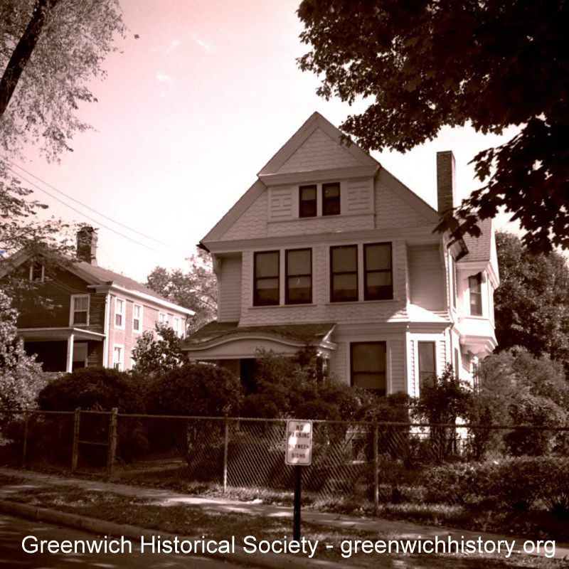 Three story clapboard and shingle home at 47 Arch Street, on the northeast corner with Grigg Street, with view of the second story bay window. The first story has a half width front porch with an elliptical roof and a bay window opposite it, topped by four projecting windows on the second story and the front-gabled third story with decorative mill work.Collection