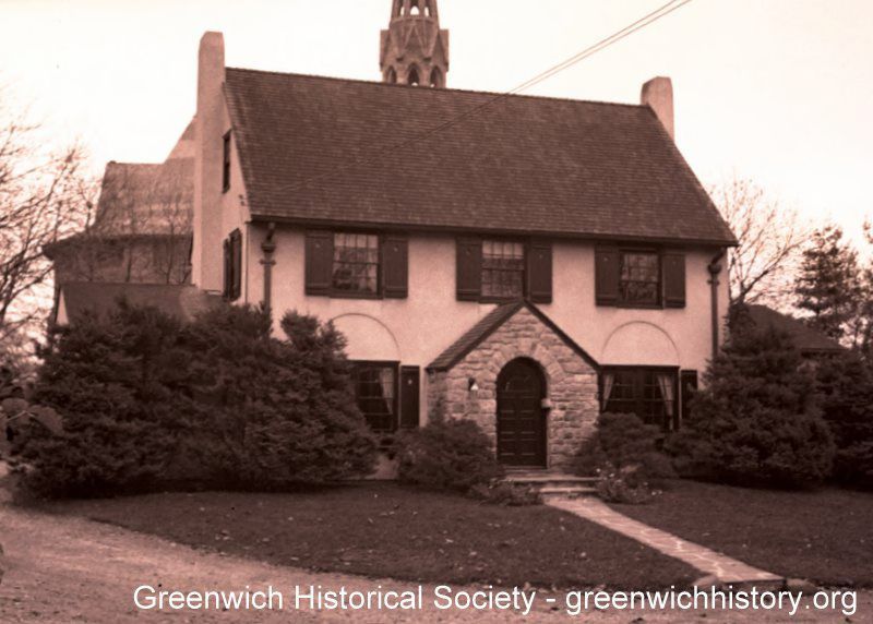 Two story home at 2 Maher Court, circa 1937, with part of Second Congregational Church visible in back. The house has a projecting stone entrance with an arched doorway.Collection