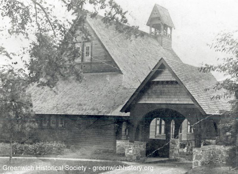 Original chapel of St. Paul's Episcopal Church, Riverside, built circa 1876 on Chapel Lane. The shingle style structure with bell tower and drive through side entrance portico rest on stone foundation.Collection