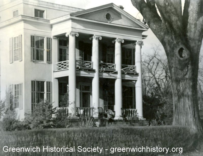Detailed view of the full-height front porch of the Livingston home on Clapboard Ridge Road. Ionic columns enclose the porch and its second story balcony.Collection