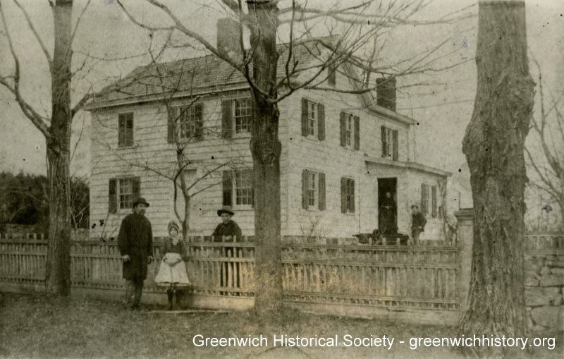 Home of Thomas A. Haight, blacksmith, on the northeast corner of Old Mill Road and Round Hill Road. The yard is surrounded by a fence and stone walls. A man and two children stand by the fence in front and a woman and man are at the side of the house.Collection