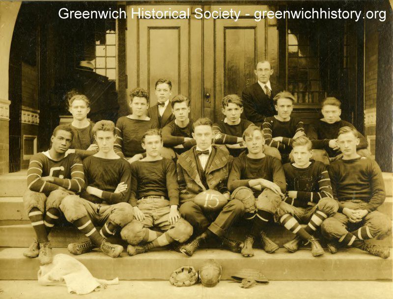 Members of the 1915 Greenwich High School football team. Back row, left to right: Wanko, Flood, Crichton, Hennigar, Larson, Washburn, Kelly, Pendleton. Front row, left to right: Van Dyke, Schofield, Babcock, Captain Halligan, Outwater, Sandreuter, Mac Nicol.Collection