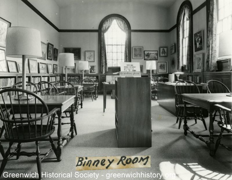 Binney Room at Perrot Memorial Library in Old Greenwich with tables, captains chairs and lamps for reading. The room is distinguished by very tall, arched windows.Collection