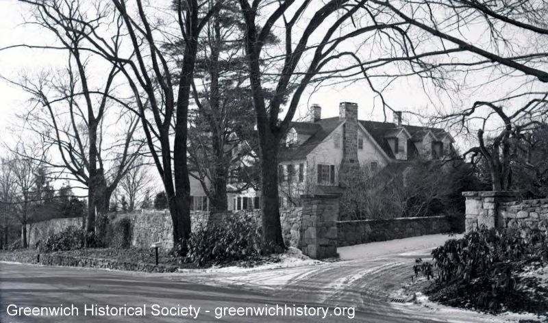 Street view of main house surrounded by stone walls. Stone pillars abut the driveway entrance.Collection