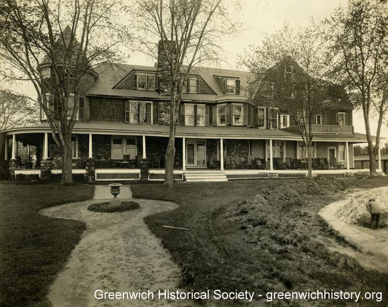 This was the home of William G. and Lillian Happy, When it became an Inn, Betty Richmond ran it for eight years. The three story field stone and shingle waterside building with a field stone and shingle facade had a full length wrap around porch off the first floor and a smaller porch off the second floor; a two story round turret with conical roof; a second story bay window; multiple dormers in the roof; and a field stone chimney.Collection