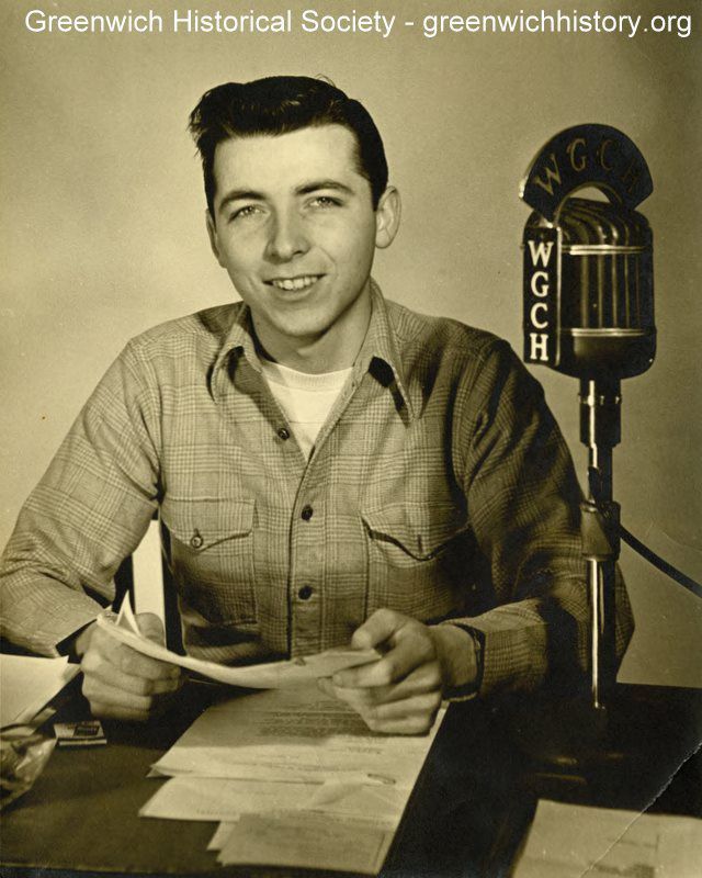 Ira Harsell, announcer for radio station WGCH, 1490 AM, with papers and microphone.Collection