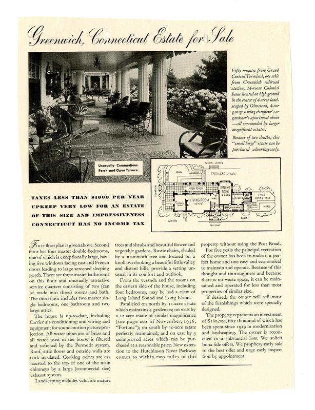 Ad with an image of the house's terrace and a floorplan. Ad also has information on the house's location, rooms, and grounds.Collection