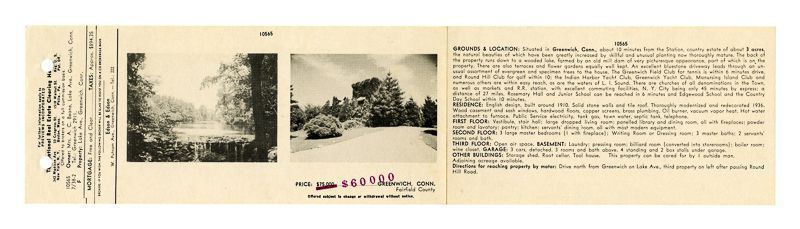 Ad with an image of a lake on the property and an image of the house, hidden by trees. Ad also has information on the house's location, grounds, architecture, rooms, outbuildings, and price.Collection