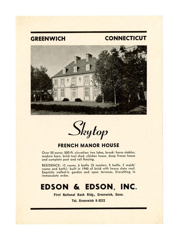 Ad with an image of the house and information on its location, grounds, rooms, and outbuildings.