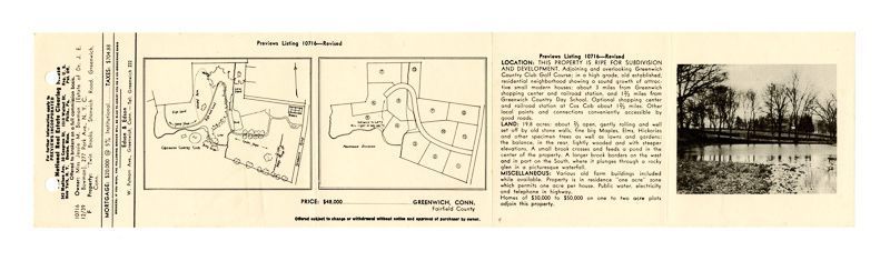 Ad with an image of a pond on the property and a map and plan of the property. Ad also includes information on the property's location, grounds, and price.Collection