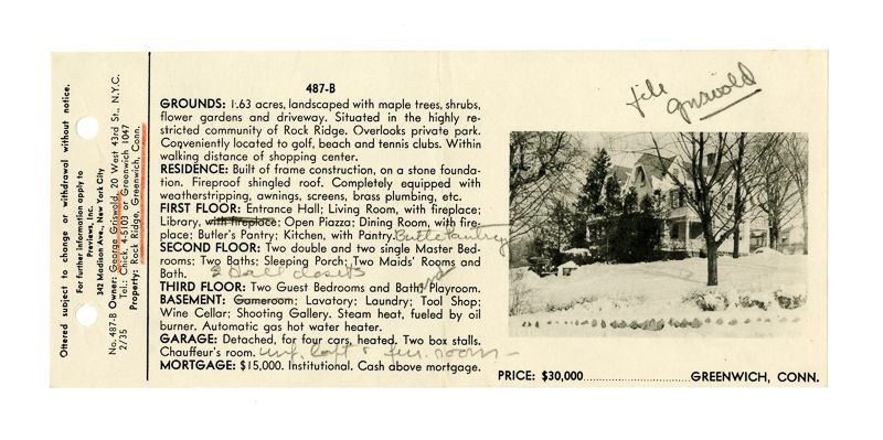 Ad with an image of the house in the snow and information about its grounds, rooms, and price.