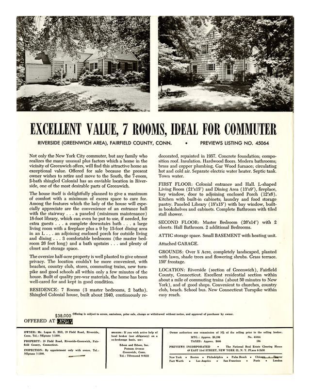 Ad with two images of the house and information on its location, grounds, rooms, and price.
