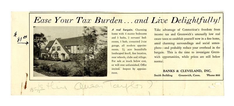 Newspaper ad with an image of the house and information on its rooms and grounds.