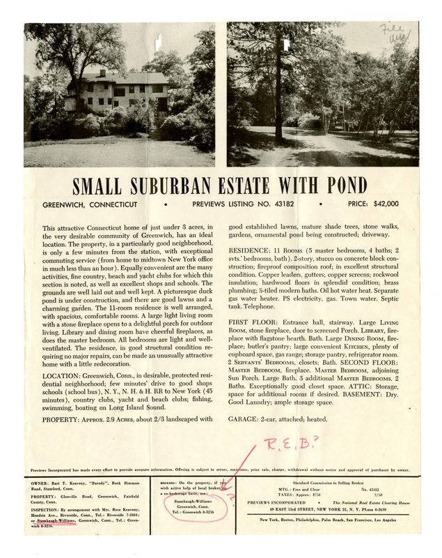 Ad with an image of the house and an image of part of its grounds. Ad also has information on the location, grounds, and rooms.Collection