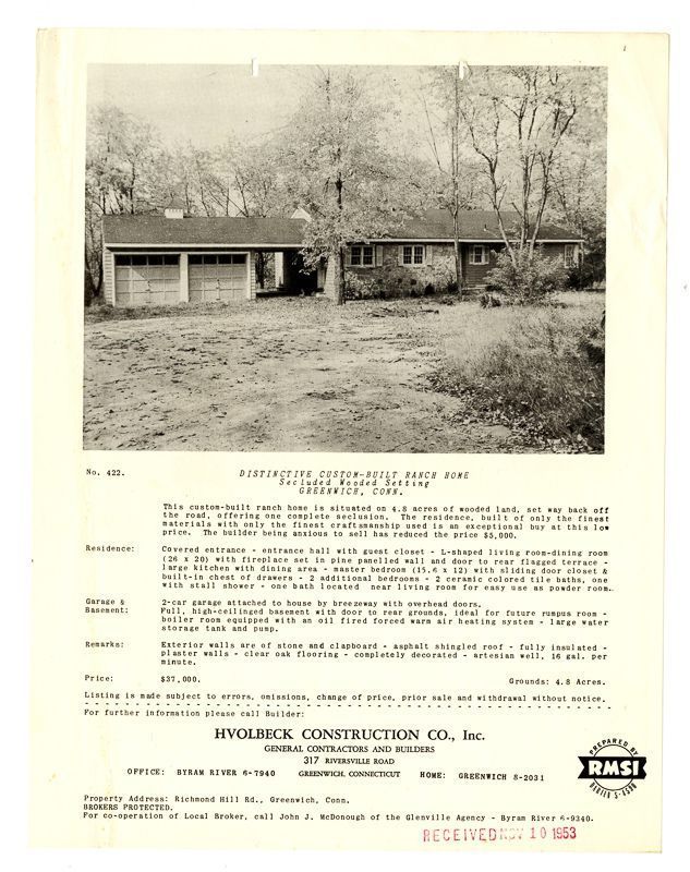 Ad with an image of the house and information on its location, grounds, rooms, and price.