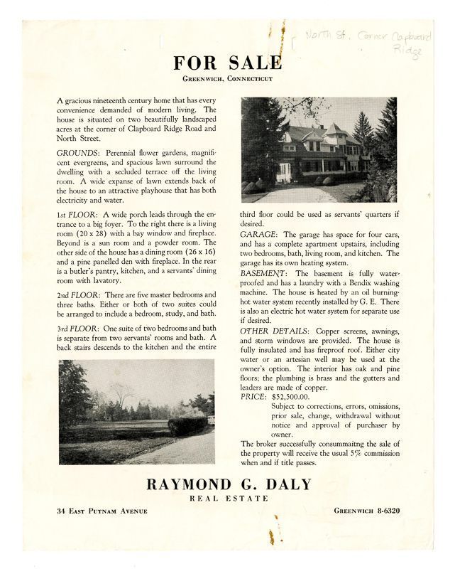 Ad with an image of the house and an image of its lawn. Ad also has information on the house's location, grounds, rooms, garage, construction, and price.Collection