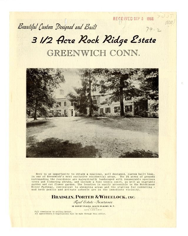 Ad with an image of the house as viewed from its lawn. Ad also has information on its location and grounds.