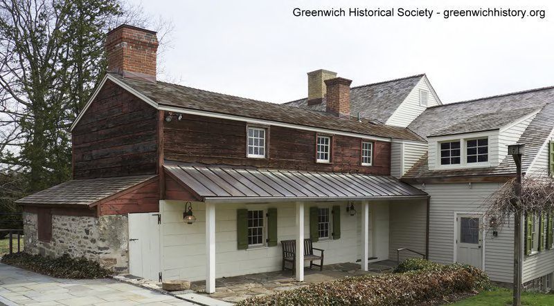 Rear view of the Bush-Holley house from the southwest showing the side porch with two windows and shutters, two entrance doors, rear storage area and entrance, second story windows and dormer, and three chimneys in the roof line. A bench sits between the windows under the porch roof and lanterns hang at opposite ends of the porch.Collection