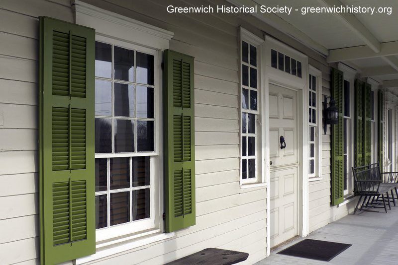Front side door with four over four panels and a center knocker, surrounded at the sides by tall six over six small paned windows and at the top by a small five pane window. A black lantern is hung north of the entrance. A large, nine over six pane window with green, three panel, louver shutters is on the south side of the entrance and two taller windows with shutters are on the north side. Benches are in front of the windows.Collection