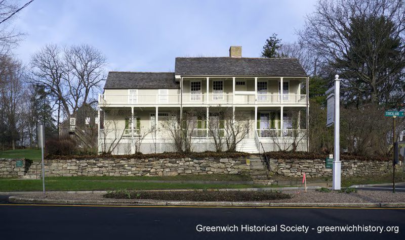 Front view of Bush-Holley House and Strickland Road with signs for the Greenwich Historical Society in front.Collection